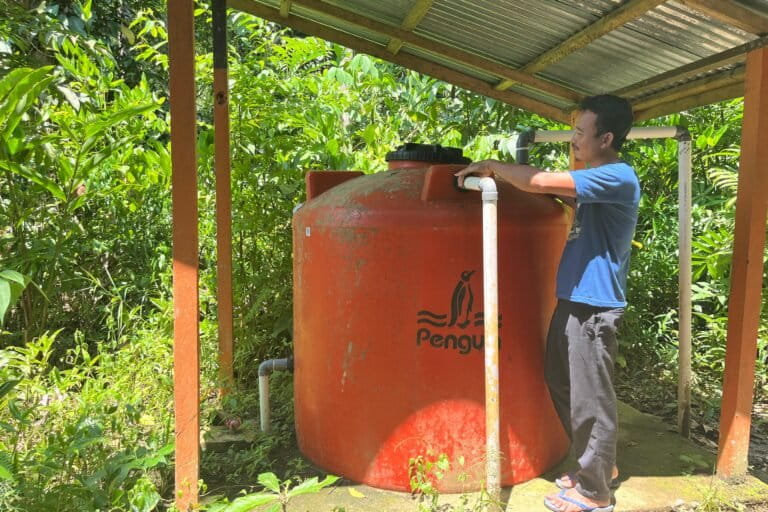 Salah satu warga Desa yang lokasinya berdekatan dengan objek wisata Batu Jatoh, Kabupaten Sekadau, sedang mengecek tangki air untuk dialiri ke rumah-rumah warga. Desa tersebut menjadi pelopor pertama yang berhasil meraih status ODF pada 13 Desember 2015. Foto: Anggita Raissa/Mongabay Indonesia