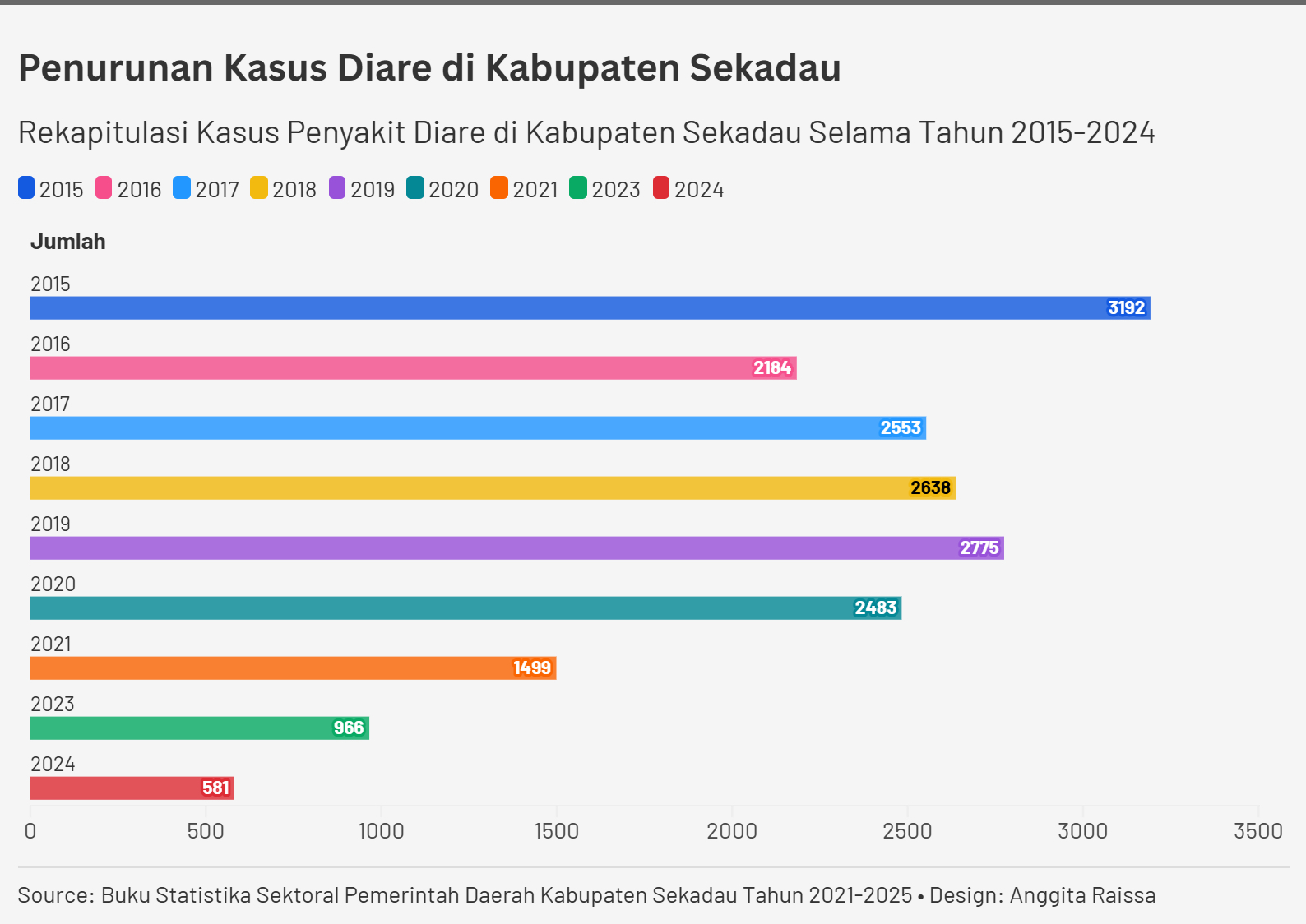 Pada 2015, kasus diare di Sekadau tercatat 3.192 kasus. Angka ini mulai menunjukkan penurunan pada 2018, menjadi 2.638 kasus, setahun setelah penetapan peraturan STBM.